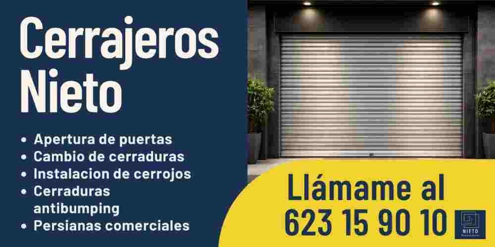 En Reparaciones Nieto ofrecemos soluciones completas para los problemas más comunes del hogar y del negocio. Atendemos aperturas de puertas, cambios de cerraduras, fugas de agua, atascos, roturas de tuberías y mucho más. Además, somos especialistas en Reparación de persianas de Comercio, un servicio clave para locales que no pueden permitirse parar su actividad. También realizamos motorización de persianas de comercio, mejorando la comodidad, la seguridad y el funcionamiento diario de tu negocio sin complicaciones.